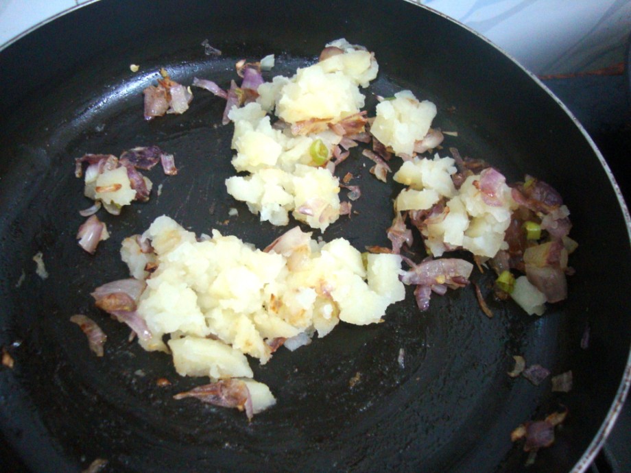 Peel the potato and chop into small pieces. Microwave for 5 minutes to get them soft. Mash them well and add to the pan.