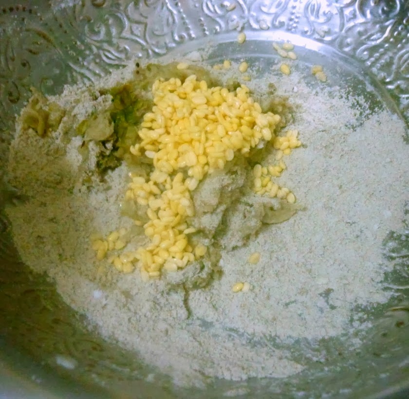 In a wide bowl, take the flour, add salt and the stuffing along with drained soft moong dal. Mix well.