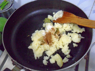 Heat a non stick pan with oil, add ginger garlic and green chilies, saute well. Then add the mashed aloo, cumin powder, salt. Mix everything well.