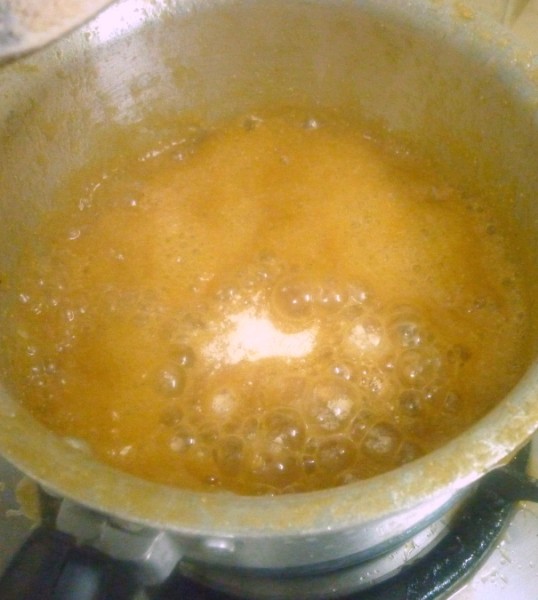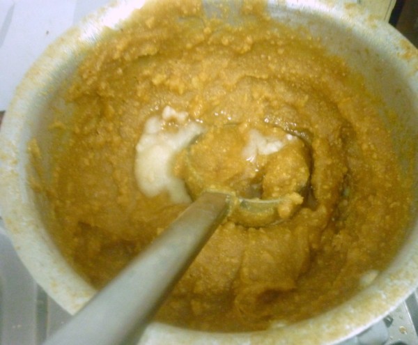 - Also since this doesn't require you to make a jaggery syrup, you can simply make it when the jaggary starts boiling. Add a tsp of ghee to the jaggery, this will prevent the flour from lumping together.