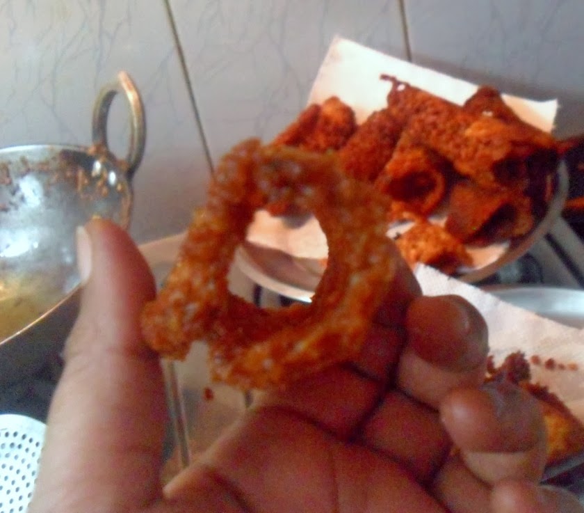 Heat oil in a pan.When oil is hot, dip your right hand in the batter, quickly along with the batter, take it over the hot oil and move the hand in anti clock wise for 3 to 4 times. Make sure the strings formed out of your fingers are falling into oil while making the shape like a circle. Rotate the hand 3 to 4 times to form a thick layer of strings.