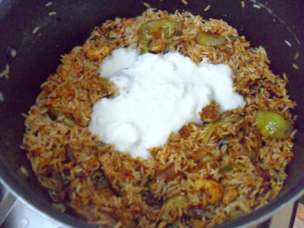 Now add the drained rice and fry for a couple of minutes. Add the goda masala and combine everything well. Next, add the curds and mix.