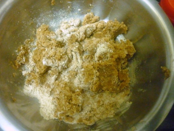 In another bowl, take the brown sugar, white sugar, olive oil, apple purée and beat well so that the brown sugar melts. Then slowly add this sugar mix to the flour and mix well. The dough tends to be sticky, so add a little bit of wheat flour based on consistency.