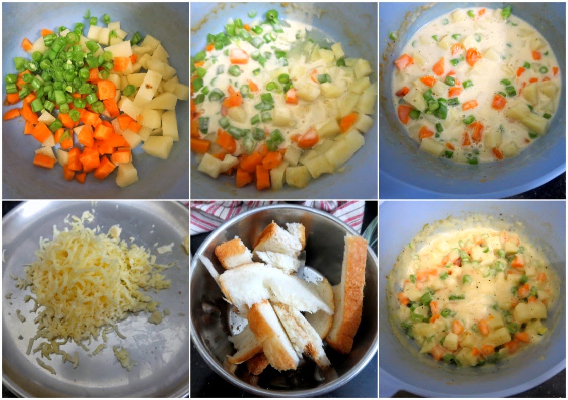 Mix all the ingredients in a bowl, mw for 2 mins with a minute interval. Let it cool down and then pulse it in a mixer to get a smooth flowing sauce. If you want to thin the sauce, simply add more milk and make it thin, as you will be cooking it when making the gratin.