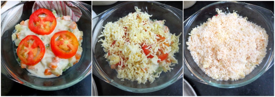 Once done, transfer to a baking tray, spread well, add grated cheese, breadcrumbs and sprinkle another layer of cheese over it.