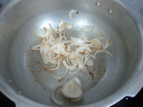 Heat oil in a pressure cooker, add the bayleaf. Then add onions, saute till brown.