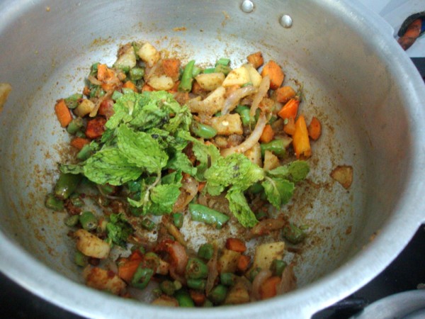 Measure 3 & 1/2 cups of water, add to the vegetables, add salt and lemon juice along with mint leaves.