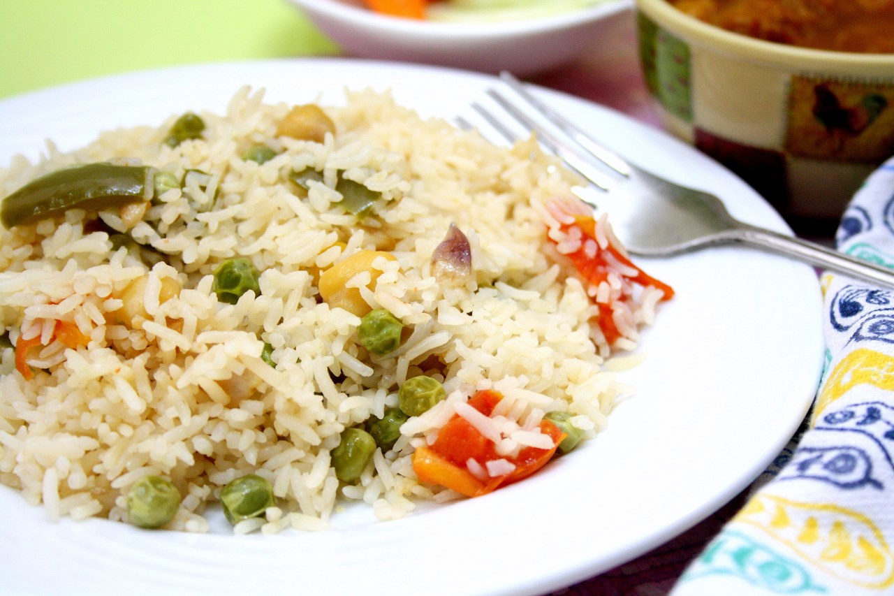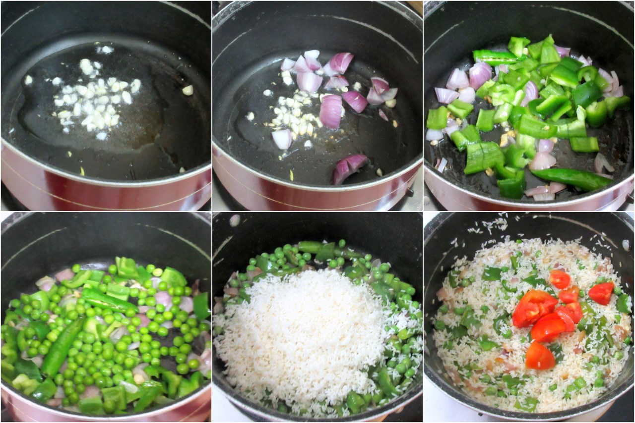 Heat Olive oil in a non stick pan. Saute the grated garlic, onion until the onions turn light brown. Add green chilies, peasm capsicum. Saute well. Add the uncooked rice