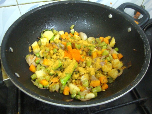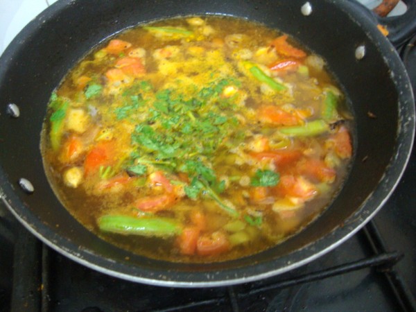 Then add cooked vegetables, saute till the vegetables are dry. Then add the coriander powder, turmeric powder and mix everything well together. Then add water and bring to boil. Finely chopped coriander leaves can be added at this stage. Cover with lid and bring to boil.