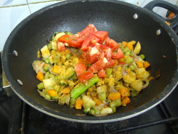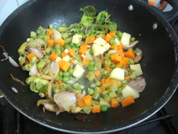 Notes: Cooking the vegetables in microwave speedups the cooking. If you can't micro, then add to the pan and cook till the vegetables are tender. In that case you can increase the water to 1:2 ratio.