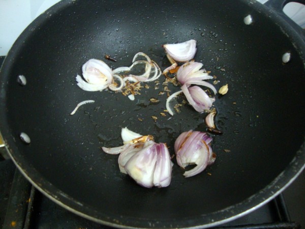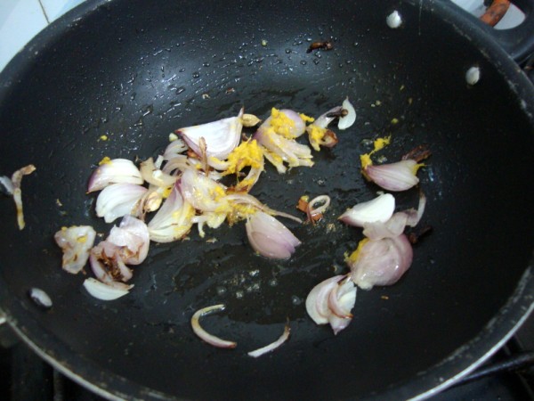 Take oil in a non stick pan, add all the whole spices. Then add chopped onions, saute well, followed by the ginger garlic paste. Cook for couple of mins til the raw smell leaves.
