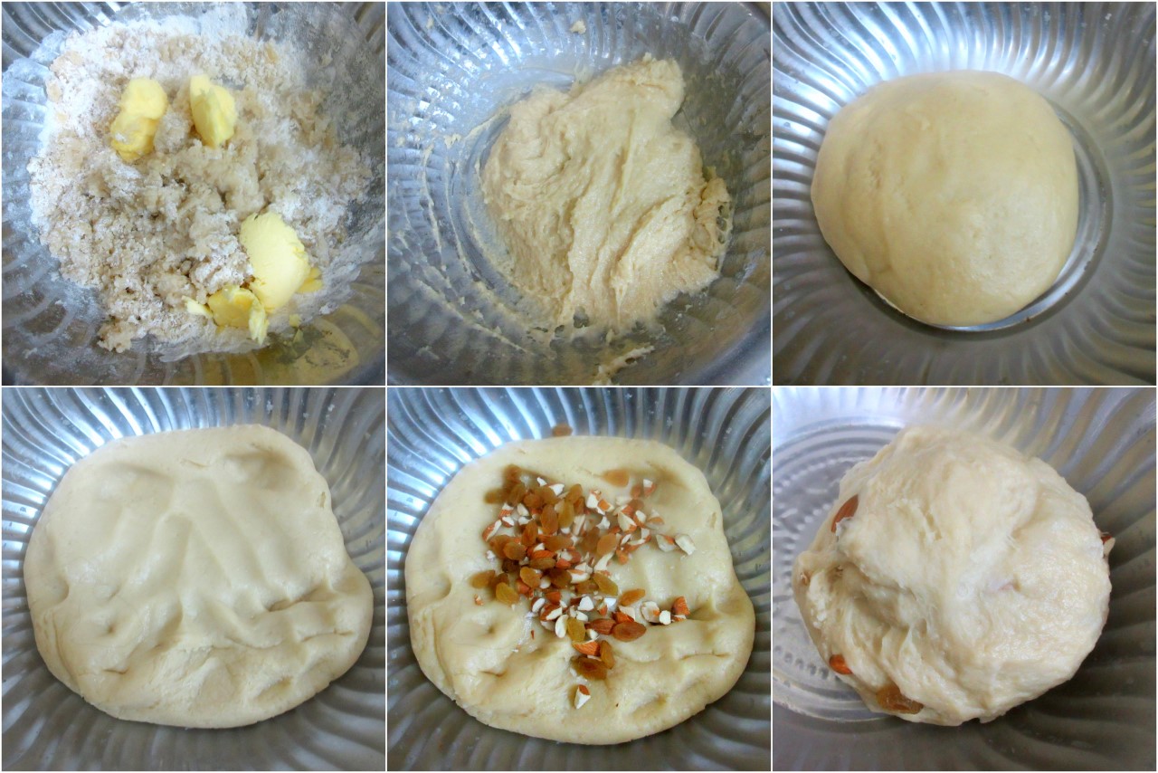 - When the dough has risen, punch it down as a disc, add all the nuts and raisins and knead well into the dough.
