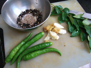 Green Chilies, Cumin Seeds, Peppercorns, Garlic, Ginger and curry leaves for seasoning