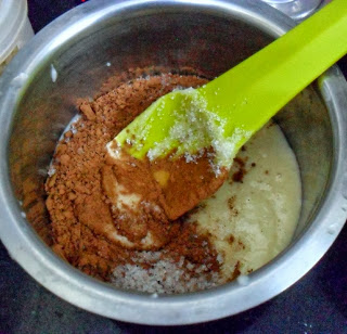 - To the second bowl, add the cocoa powder, instant coffee powder, chocolate essence. Mix well.